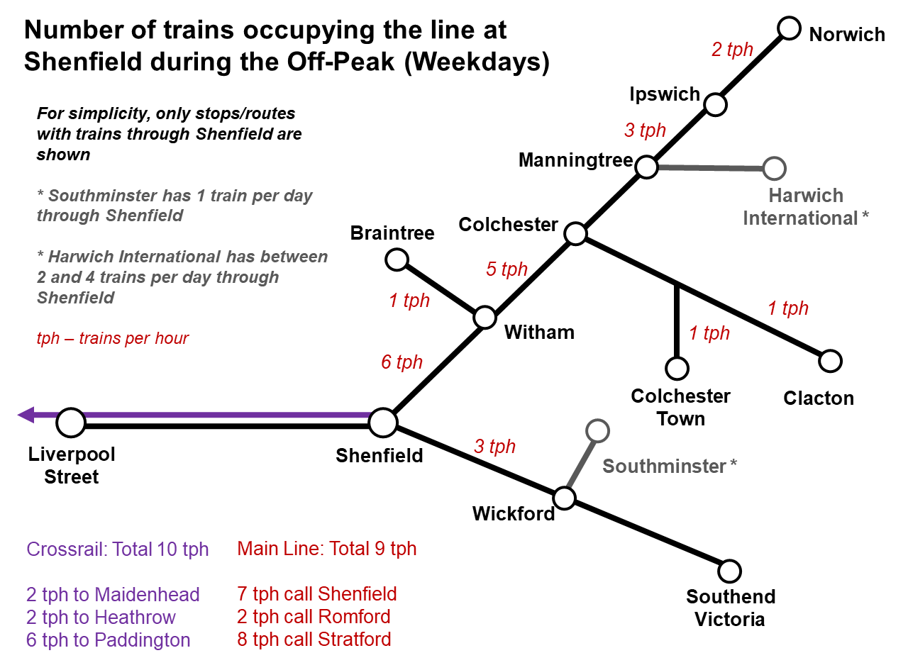 As shown, 9 trains per hour will pass through Shenfield station on the main lines in each direction during the typical off-peak weekday.