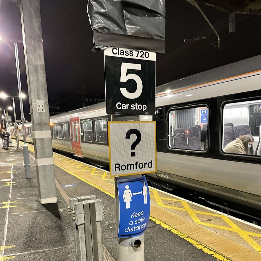| Only 6 of 10 carriages on a Greater Anglia Class 720 train fit on Romford’s platforms. The other 4 trail off the end. |