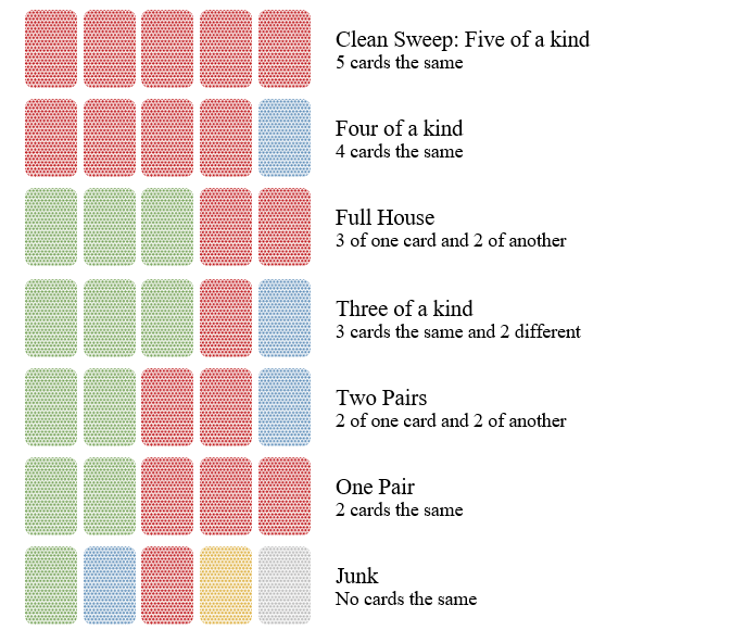 The deck consists of 52 cards in total, although it is in no way similar to a real card deck. There are six different cards with their own ranking, plus one “joker” card.